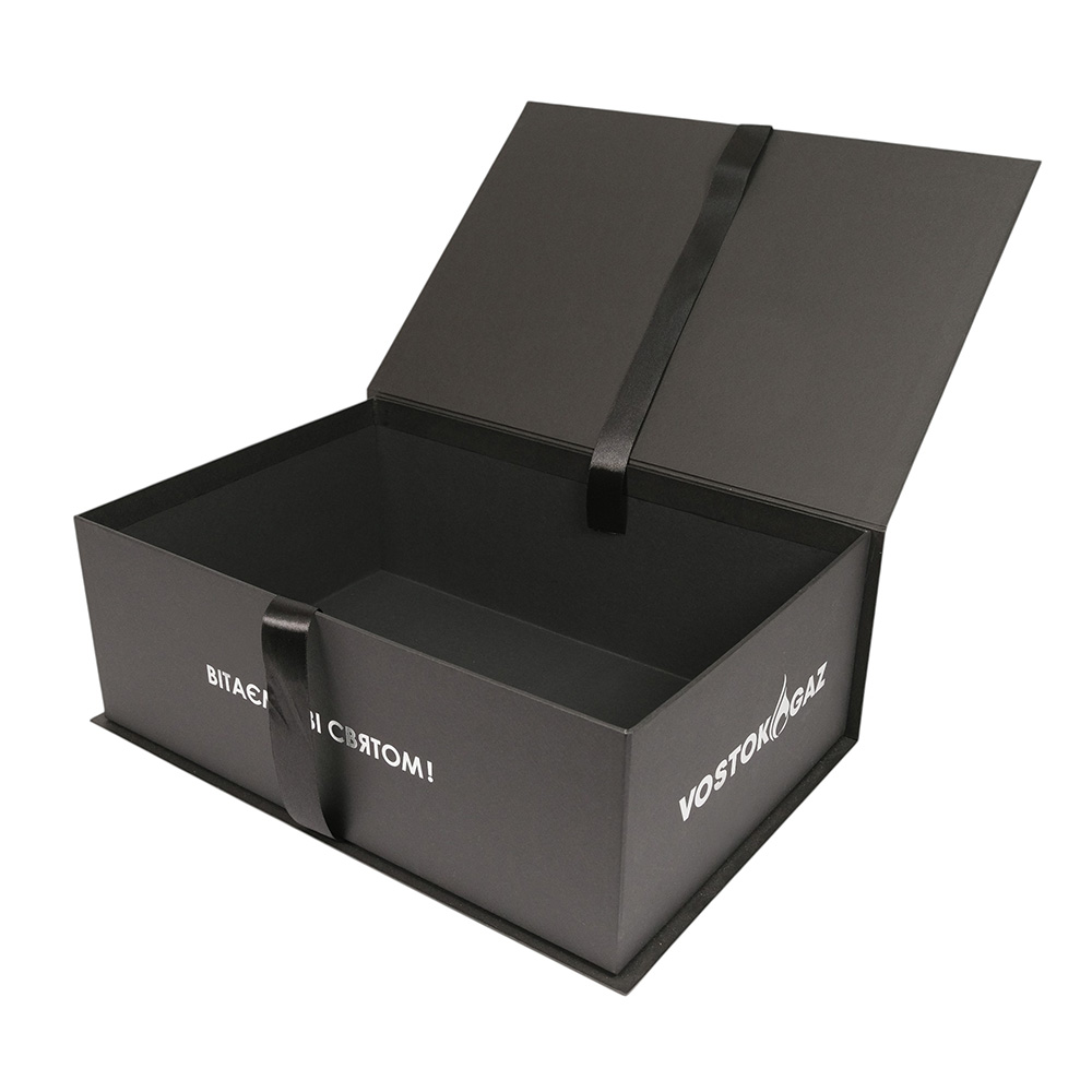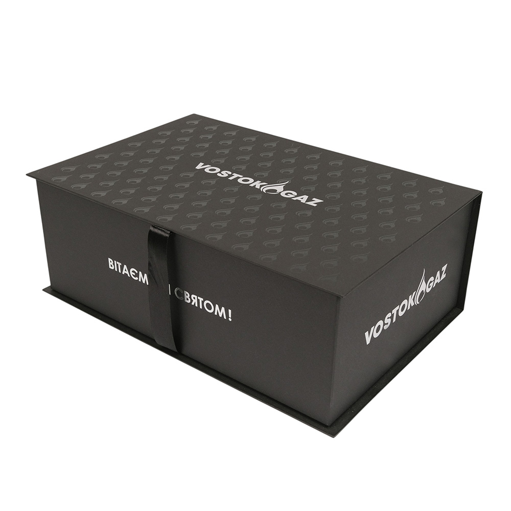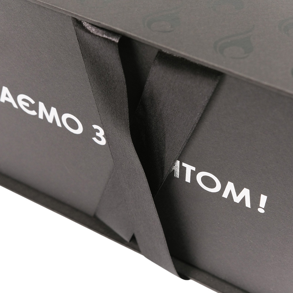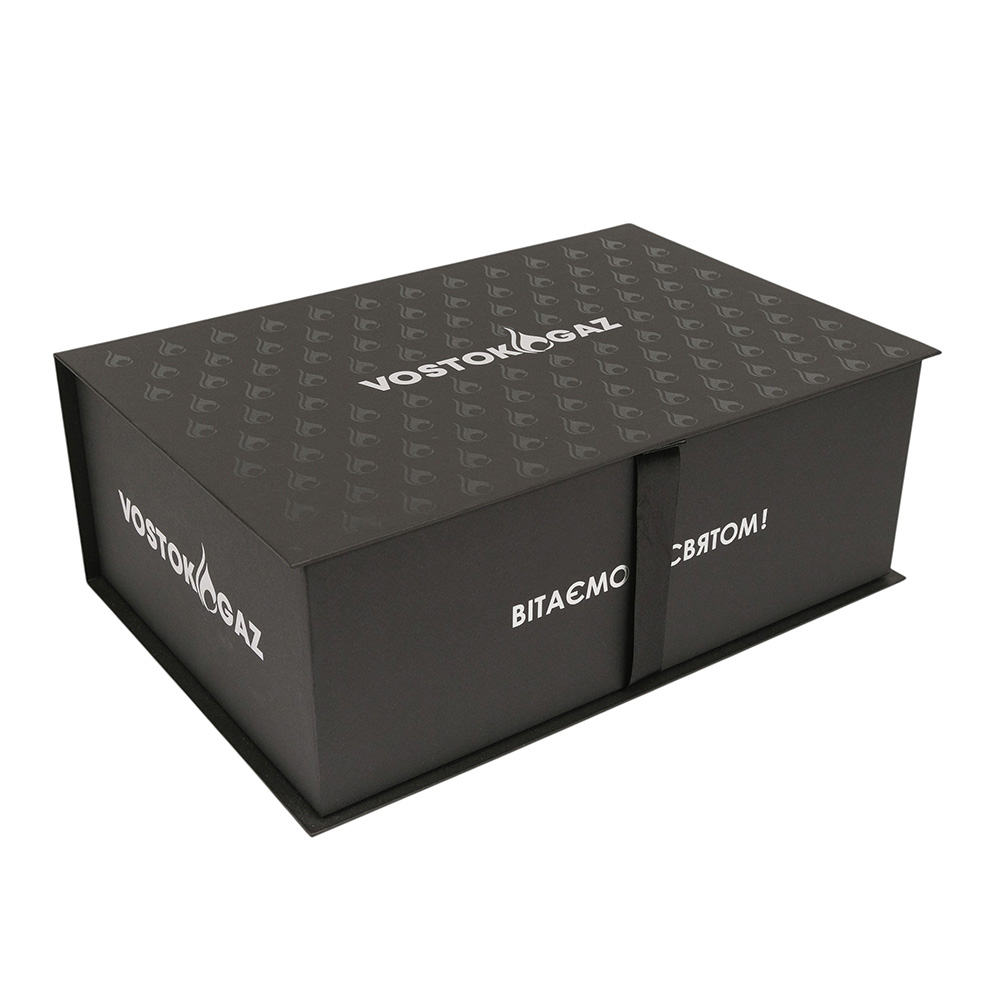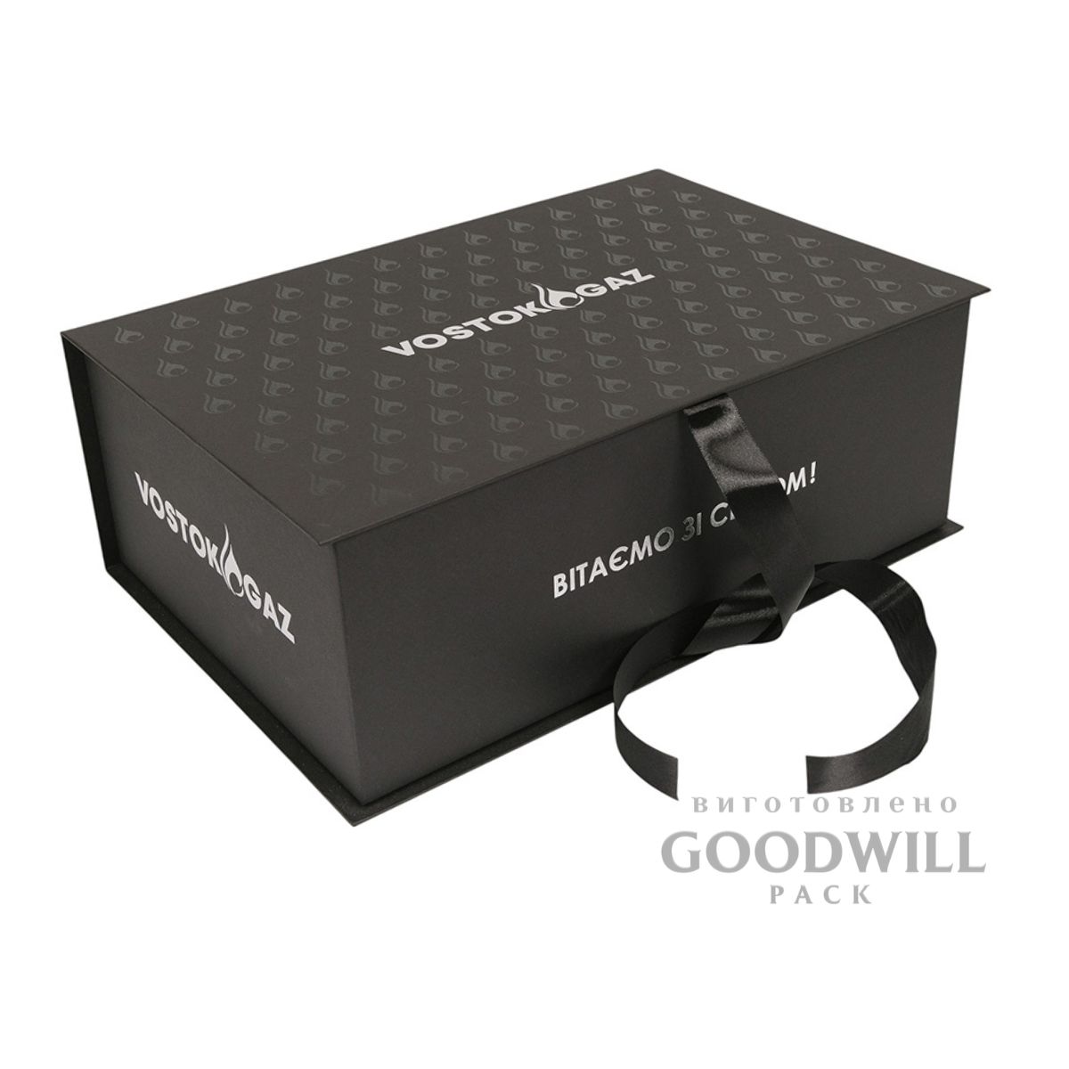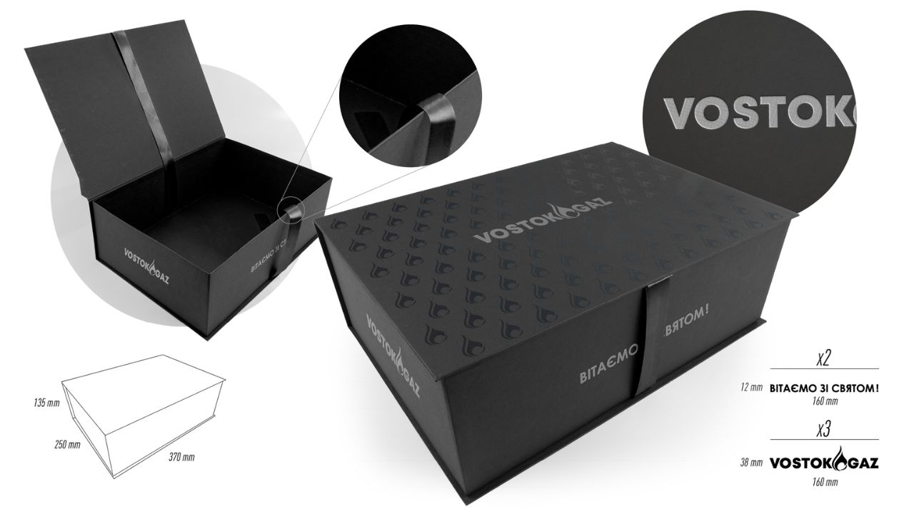 Коробка виконана в стриманих корпоративних кольорах – чорний та срібло.